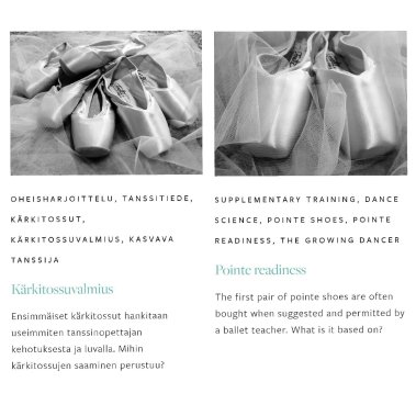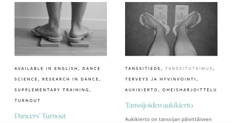 Oonasofia huomasi, ettei tanssin harrastajille ja ammattilaisille suoraan suunnattua kanavaa tutkitusta ja heitä koskevasta tiedosta ollut saatavilla ja aloitti kirjoittamaan blogia, joka tarjoaisi tähän lääkkeen; https://dancesearchblossom.com. Etenkin suomeksi tanssijoiden hyvinvointia koskevaa tutkittuun tietoon nojaavaa materiaalia on hänen (ja meidän useiden muiden) mukaan vaikea löytää. Ja jokainen englanninkielisistä teksteistä apua etsinyt on havainnut, että saatavilla on pääasiassa hyvin tieteellistä ja vaikealukuista tekstiä. Dance.Search.Blossom-blogi tarjoaa selkeitä tiivistyksiä viimeisimmästä tutkimustiedosta ja antaa kätevästi hyödynnettäviä käytännön esimerkkejä omaan kehittymiseen sekä esimerkiksi opetustyöhön.